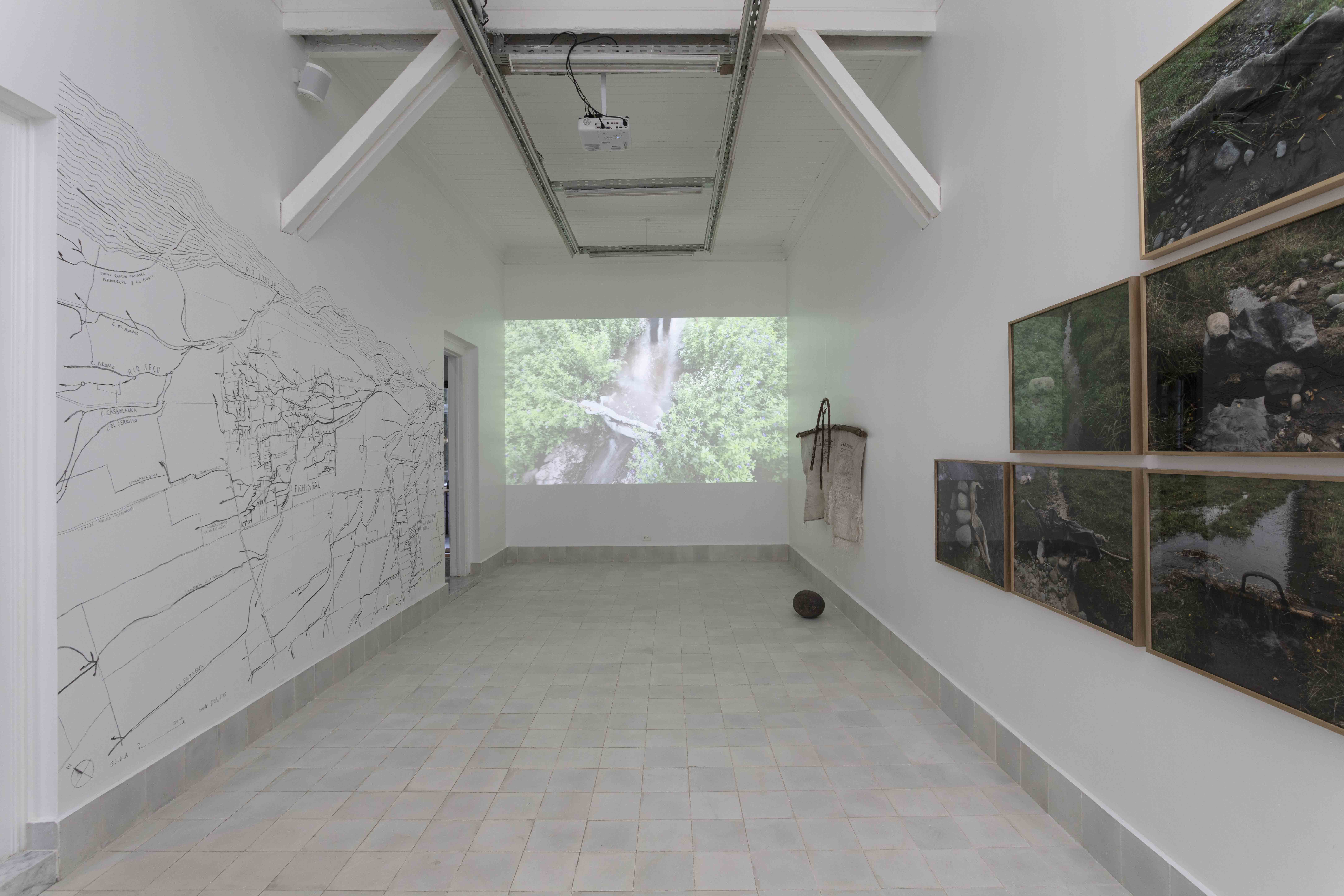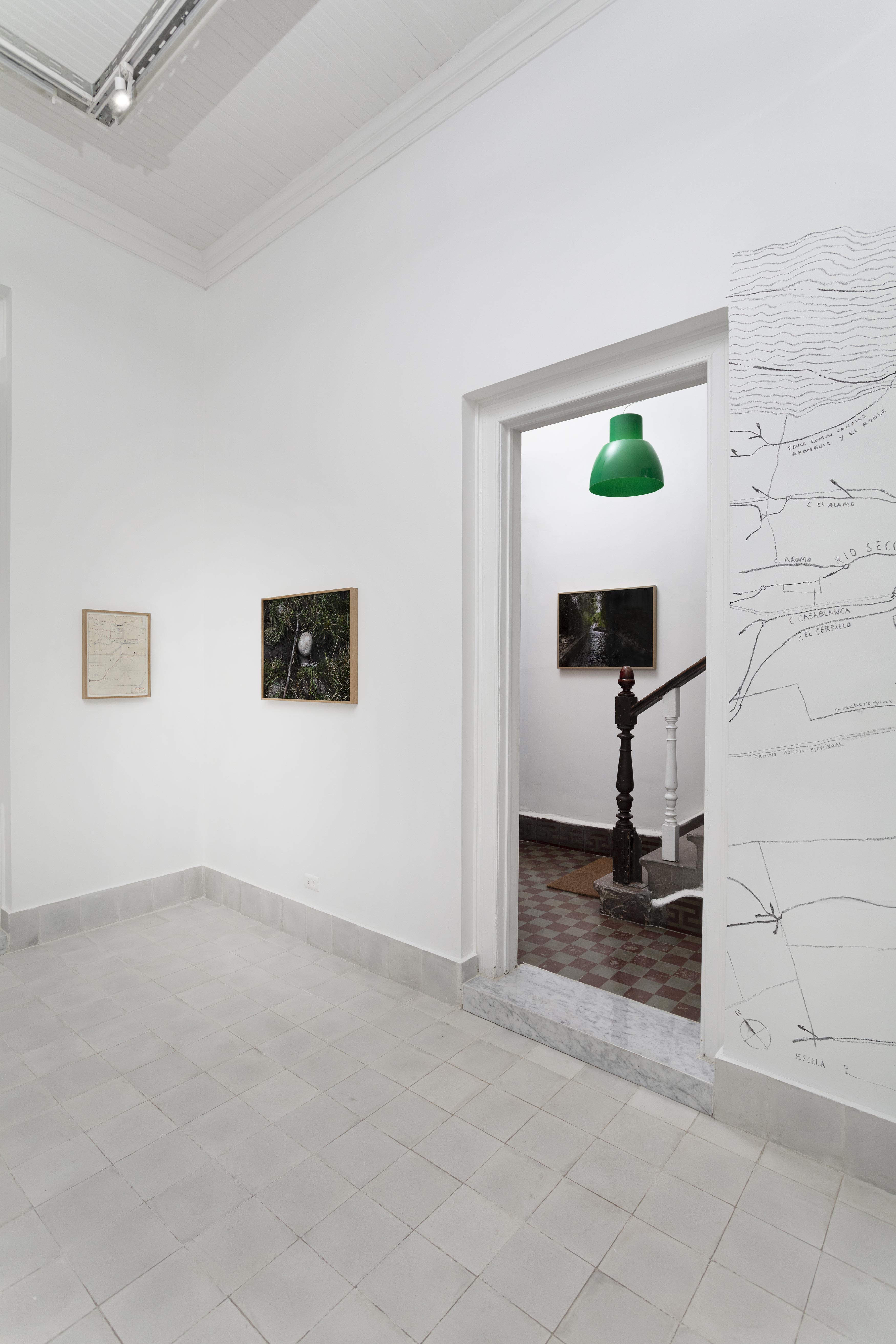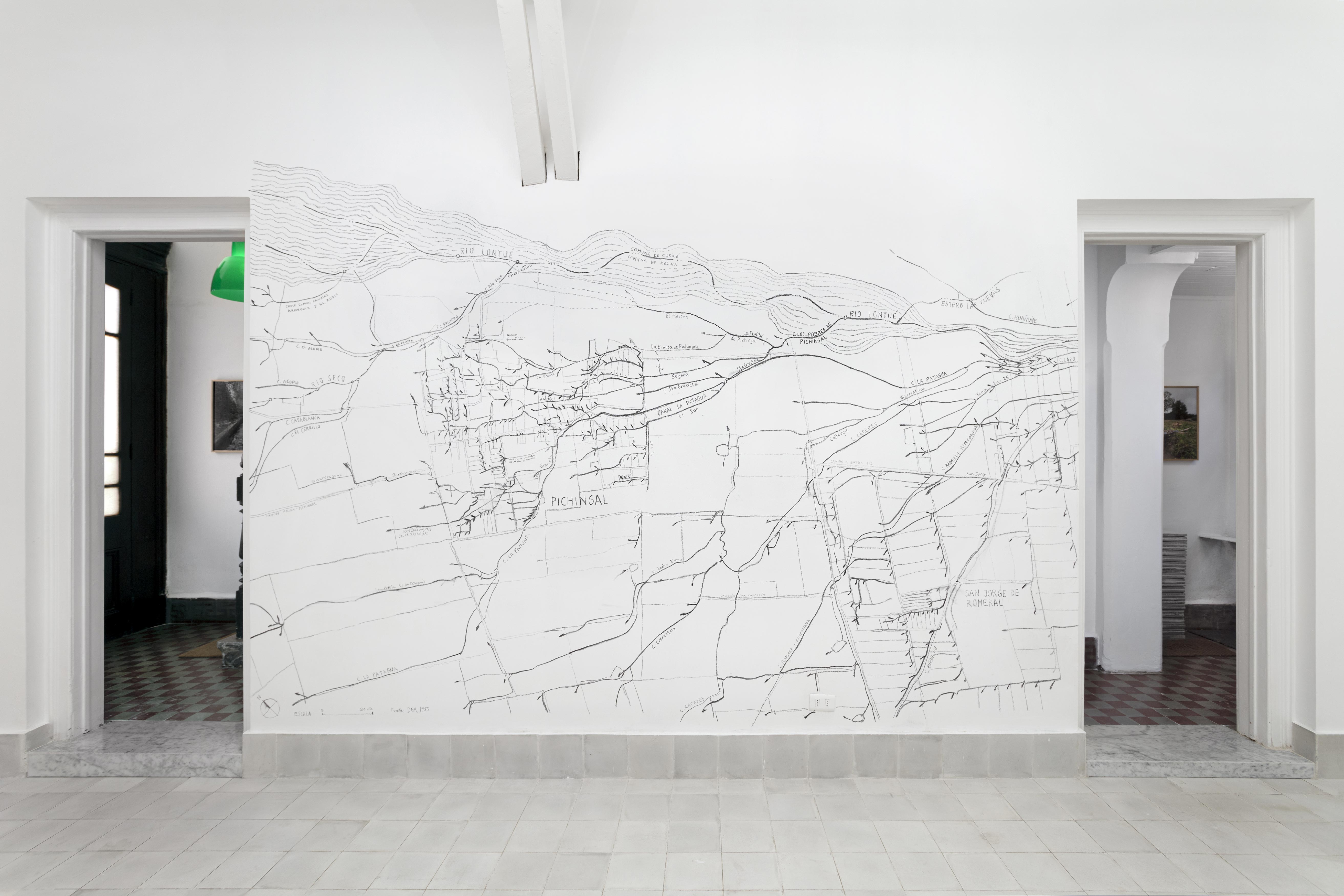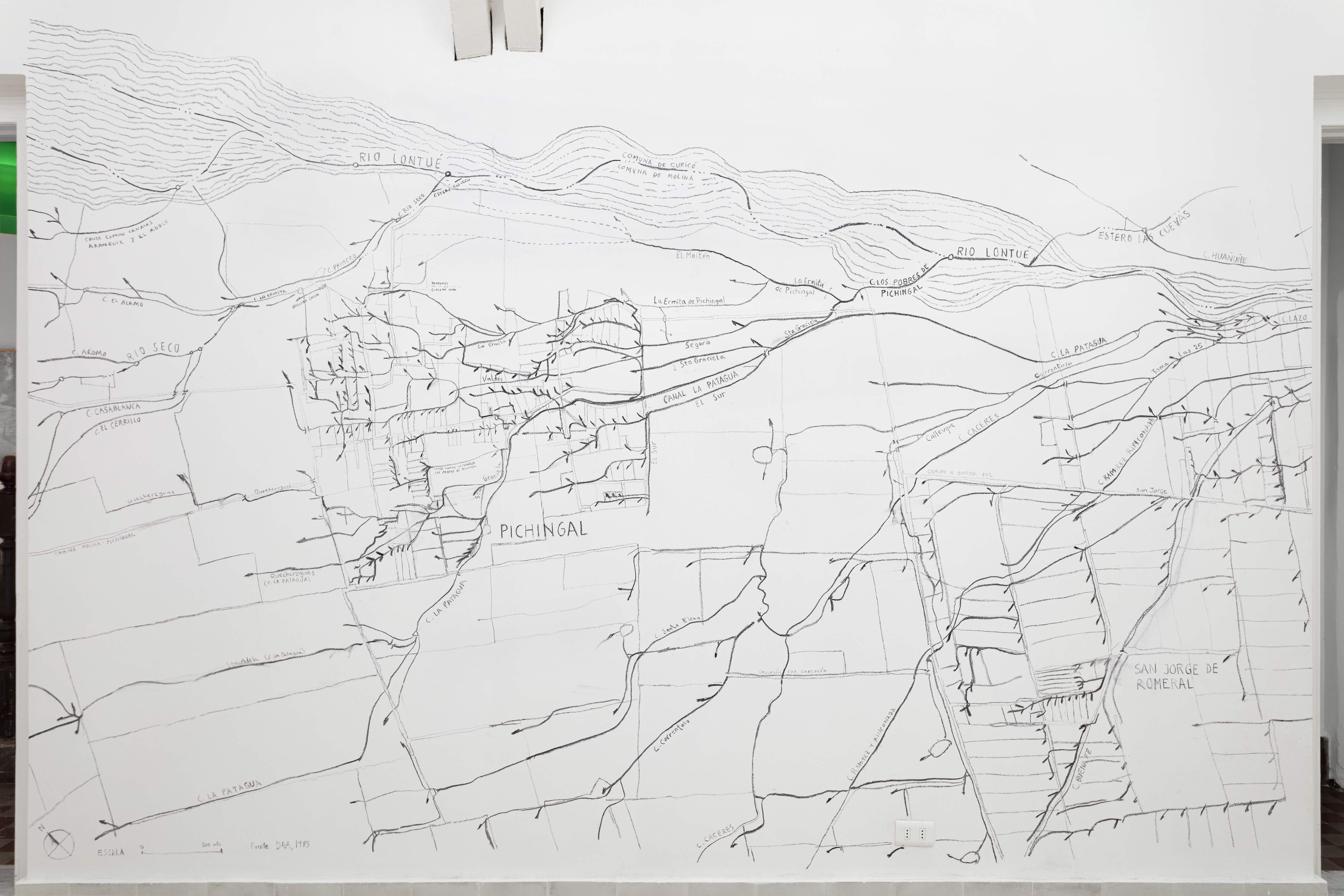 En el muro de la galería Benítez traza un fragmento de un levantamiento oficial de 1985 del río Lontué, indicando el nacimiento del Canal Los Pobres de Pichingal. A este mapa se suma un esquema dibujado a mano por el padre de la artista en la misma época, indicando la red de canales que guía el agua a través de la parcela de tierra de la familia.