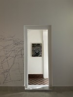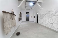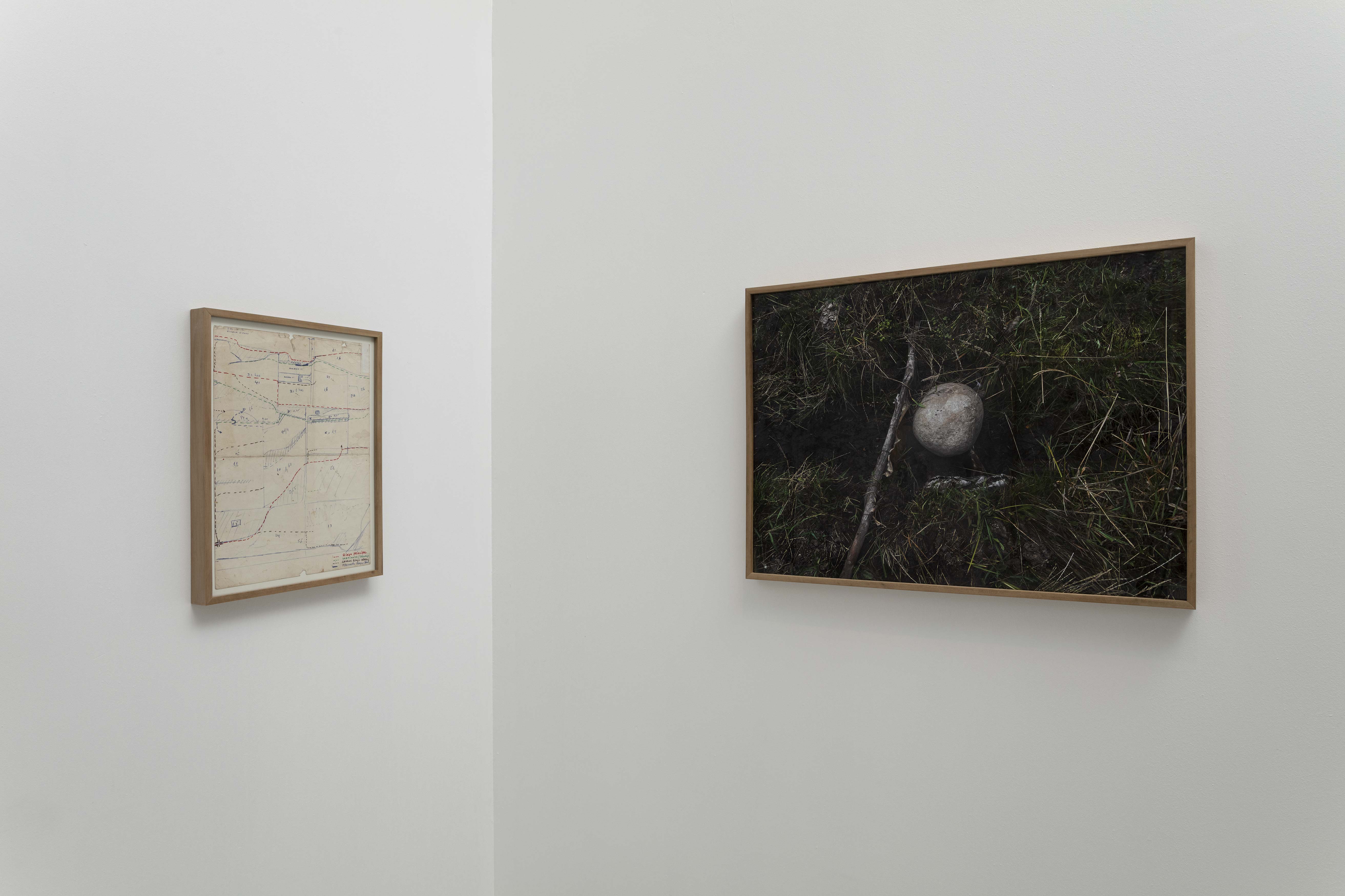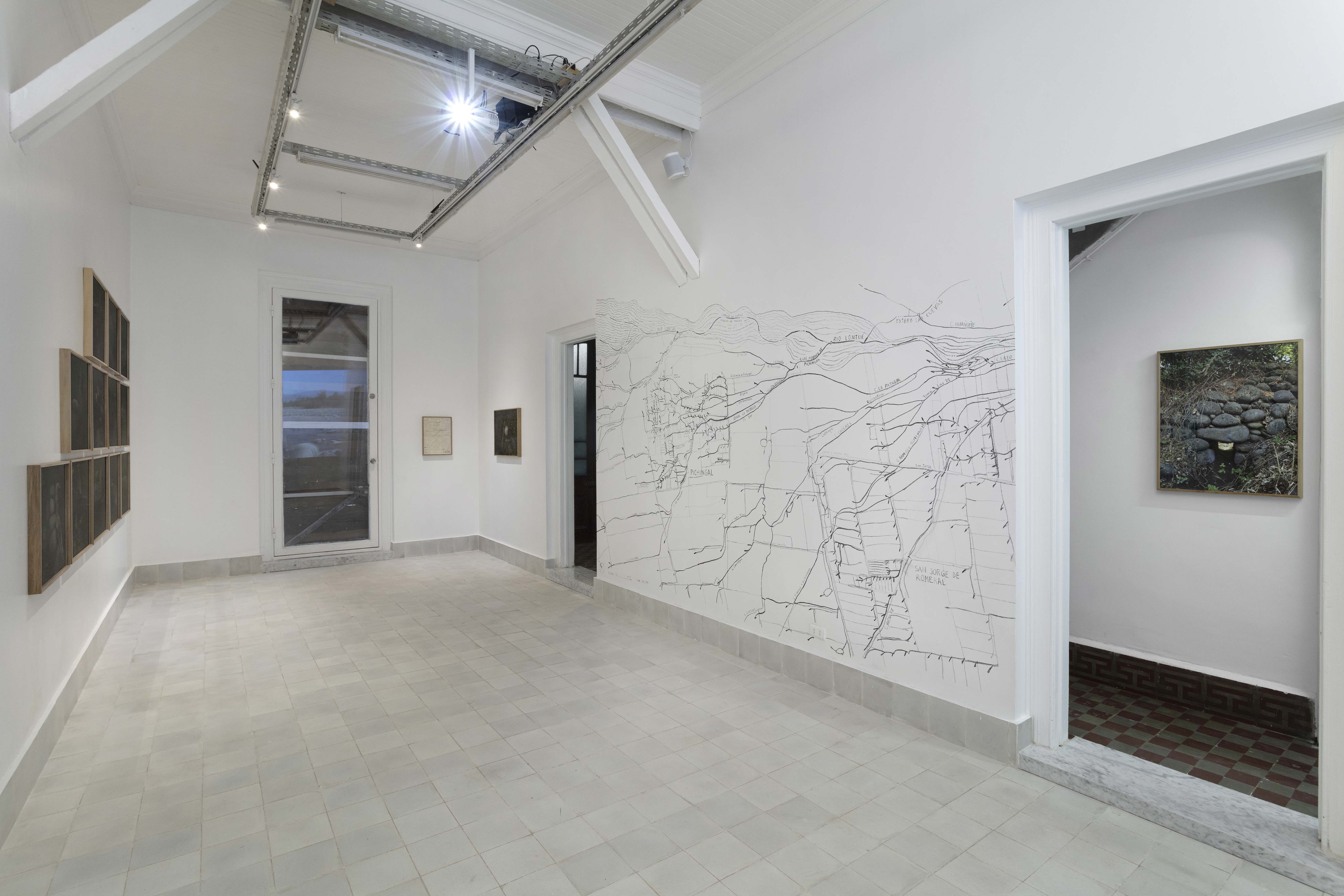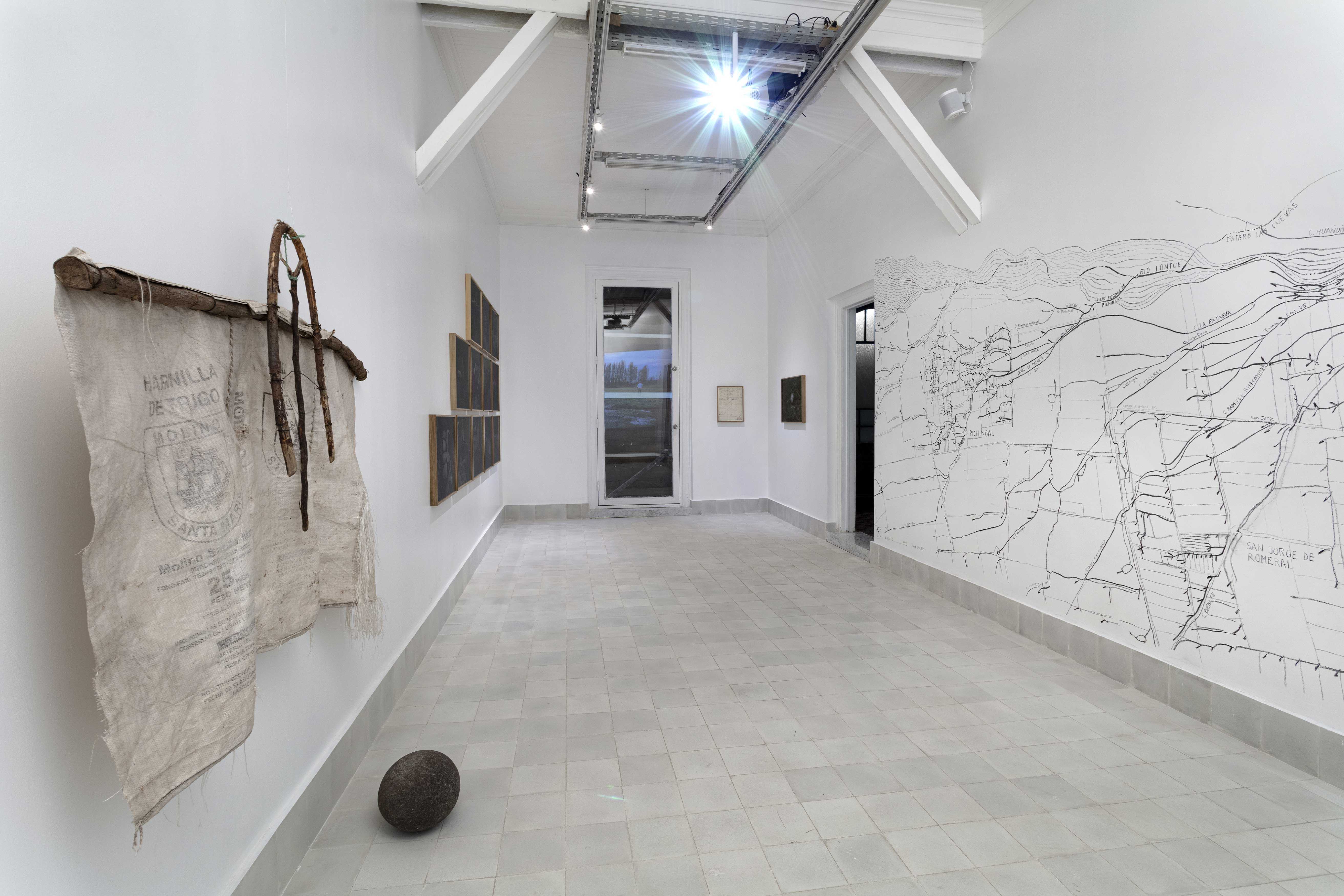 En el muro de la galería Benítez traza un fragmento de un levantamiento oficial de 1985 del río Lontué, indicando el nacimiento del Canal Los Pobres de Pichingal. A este mapa se suma un esquema dibujado a mano por el padre de la artista en la misma época, indicando la red de canales que guía el agua a través de la parcela de tierra de la familia.