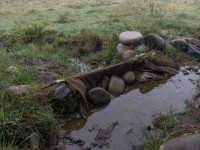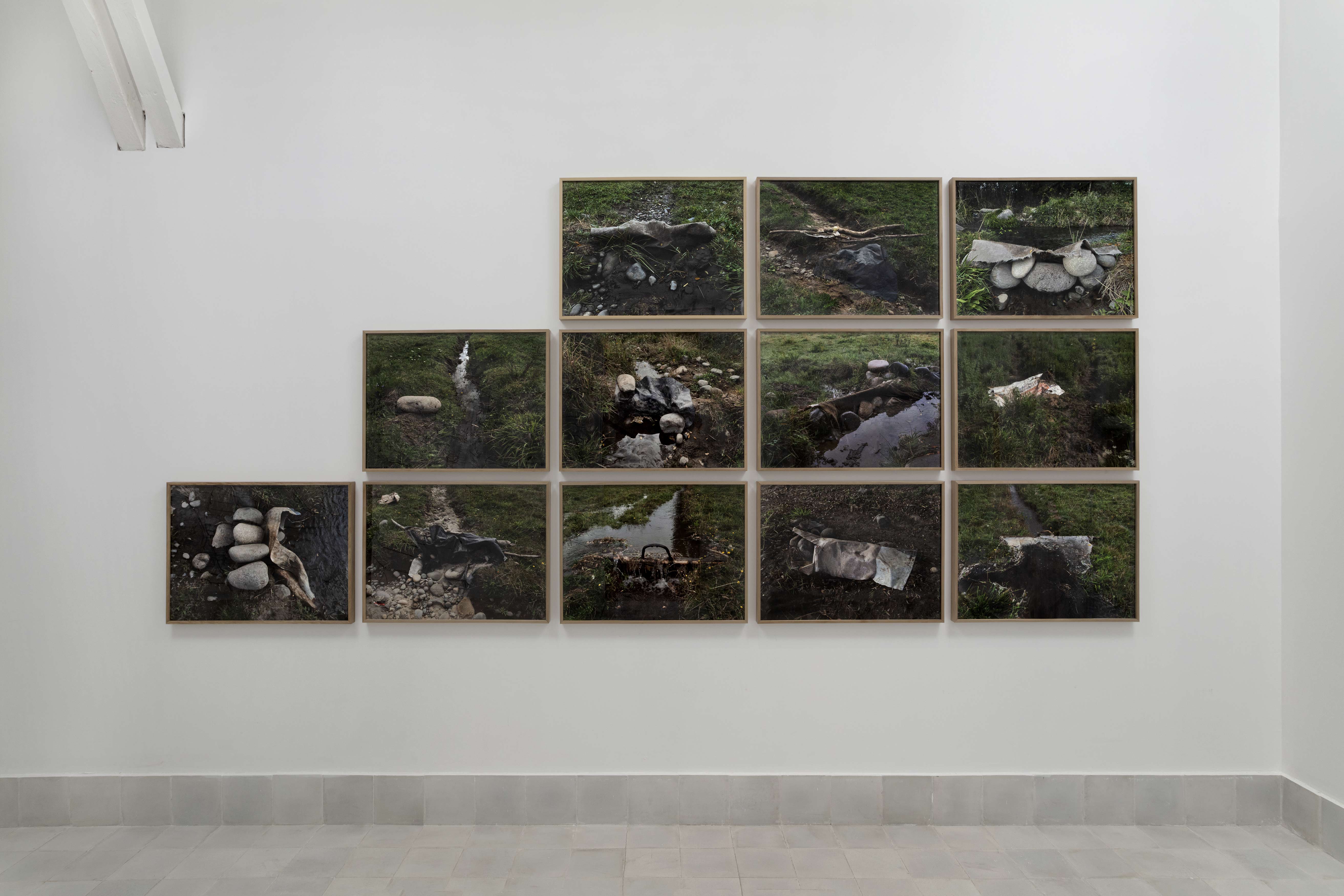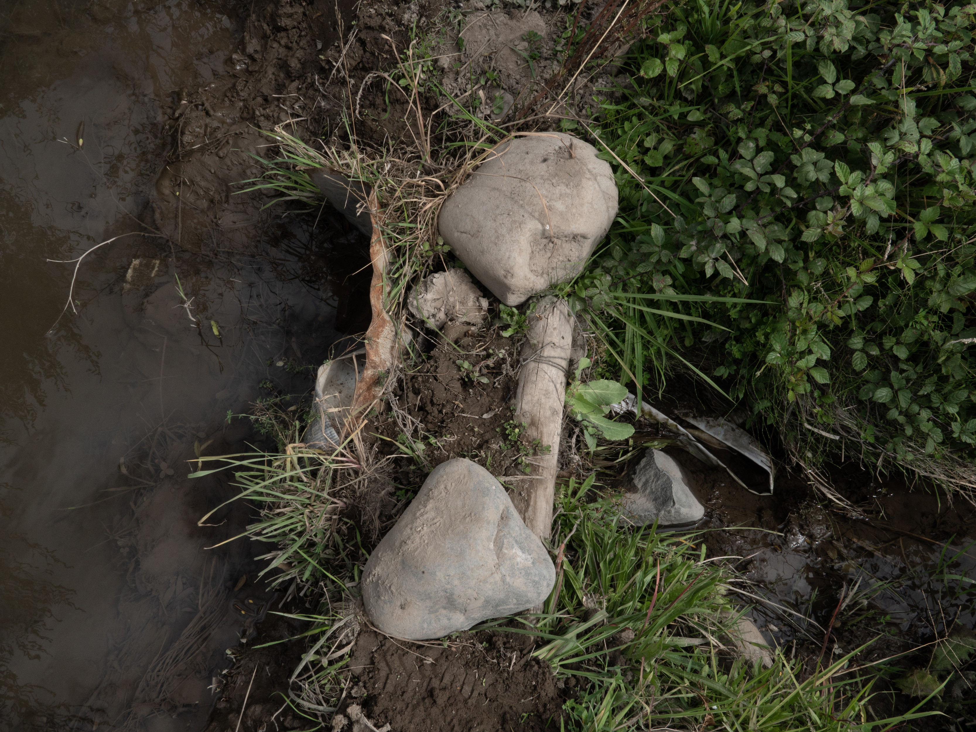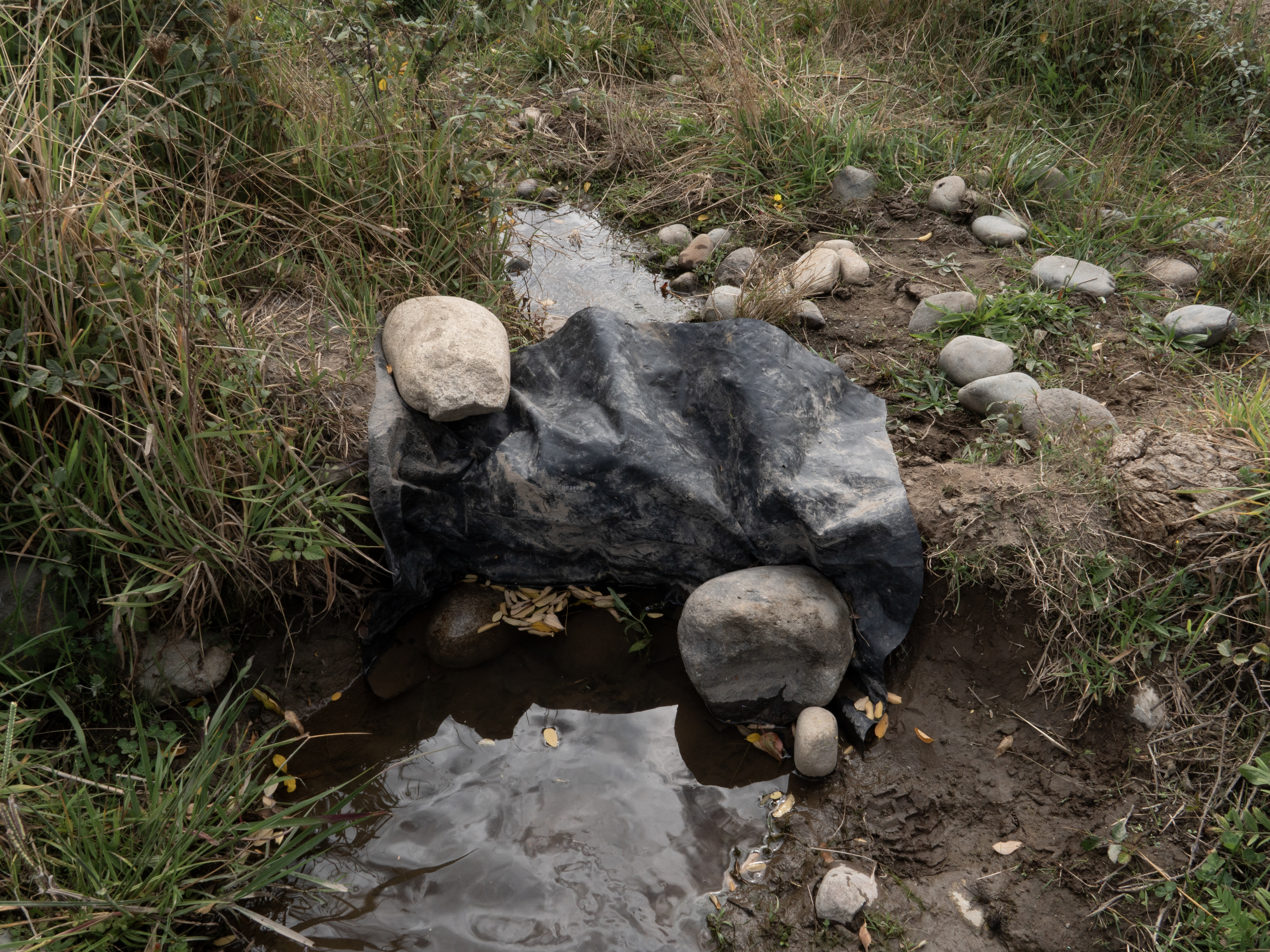 Central a Riego es un conjunto de fotografías que destacan “tacos” y “rastras” como tecnología central que sustenta este proceso de riego. Construidas a partir de objetos encontrados, estas formas improvisadas son ejemplos de lo que Benítez llama “ingeniería vernácula” para alterar el curso y compartir el flujo de un canal entre varios regantes.