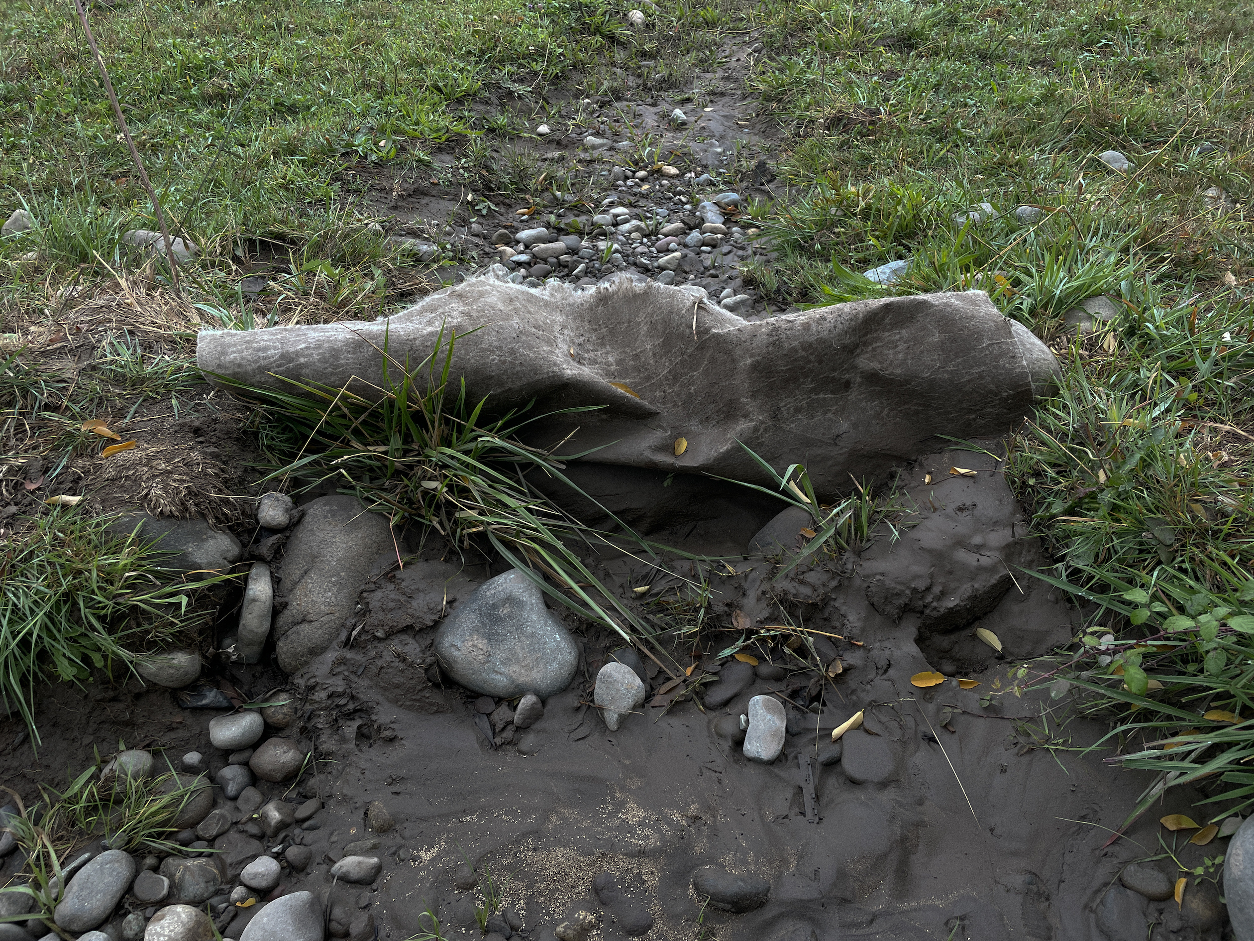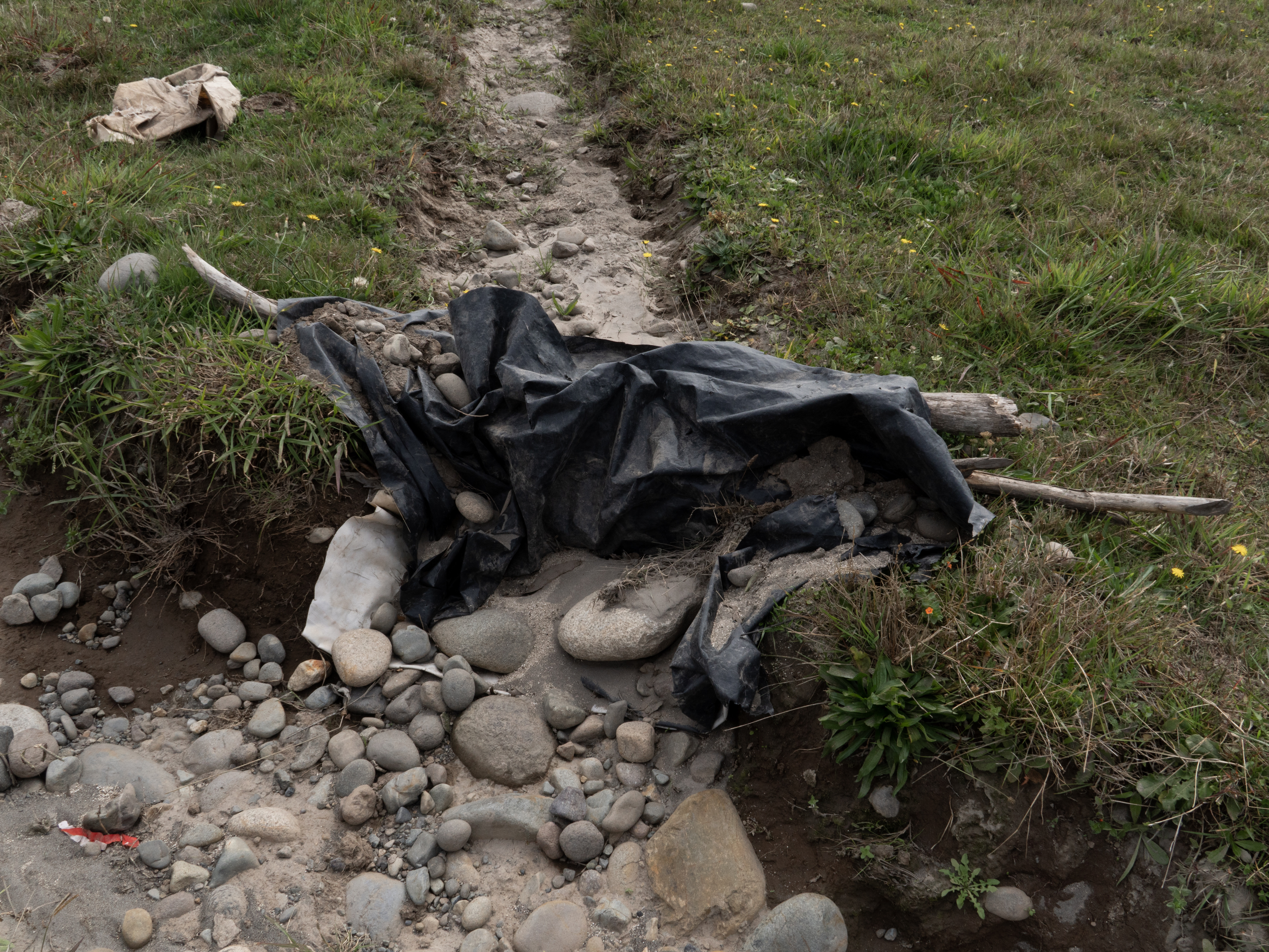 En la serie Riego, Francisca Benítez aborda el papel que juega el riego en lo que ella llama un “sistema de soporte vital” en la región donde creció: la localidad rural de Pichingal en la zona central de Chile. “He estado investigando esta práctica, sus trazados, tipologías, maneras de hacer, tradiciones, personas dedicadas. Intentando trazar la historia del canal que riega el sector rural de donde provengo, Pichingal”, nos acota Francisca. Una forma de riego que es común en esta zona se conoce como riego botado. A través de este proceso, agricultores y regantes inundan sus tierras en pedazos, desviando el agua de los canales y guiándola a través de pequeñas represas efímeras, conocidas localmente como “tacos”, usando la pendiente del terreno y la dirección de la corriente.